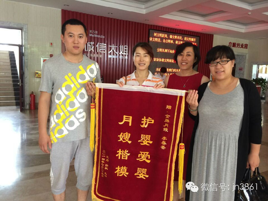 2014年7月25日上午10:28,客户庄老师、许老师夫妇给月嫂李春香送来了锦旗,李老师的付出得到了客户的高度好评“护婴爱婴 月嫂楷模”。